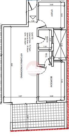 Consists of an open plan kitchen/dining/living with a front terrace, main bathroom, two double bedrooms and a box room, served with a lift and offered finished excluding bathrooms and doors.