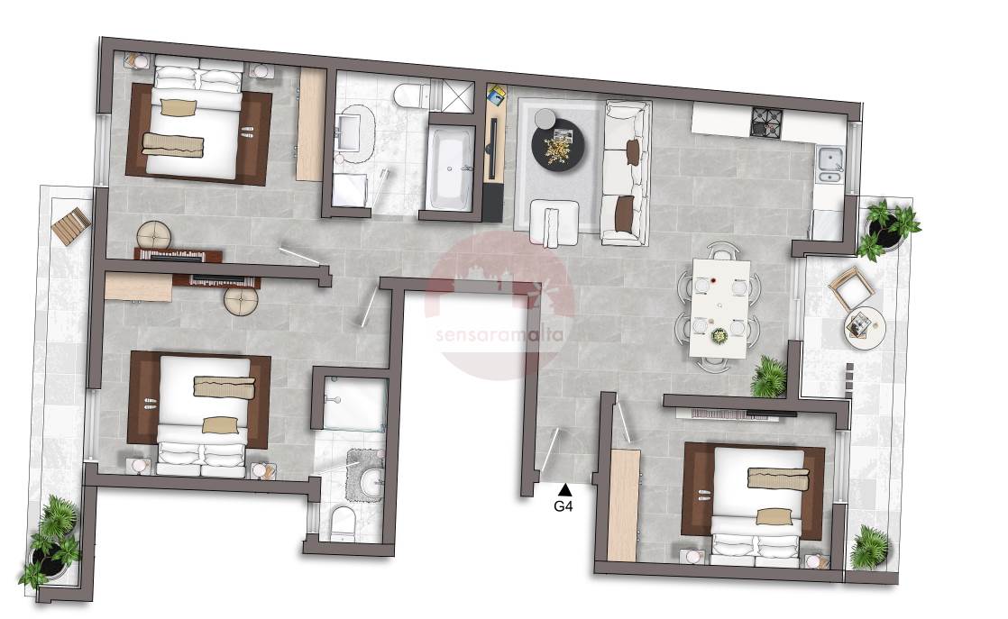 Consists of an open plan kitchen/dining/living complemented by a front terrace, main bathroom, three double bedrooms with the master having an ensuite and a private balcony.
